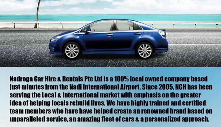 NCH Rentals is a trusted, locally owned car rental company based in Nadi, Fiji, with over 30 years of experience in the vehicle industry. We specialize in providing affordable, reliable, and customer-focused car hire services to travelers exploring Fiji's beautiful landscapes.
